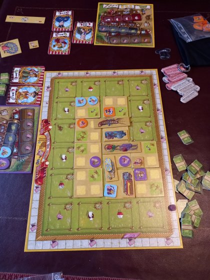 Le plateau central figure des carrés destinés à recevoir des tuiles qui sont elles mêmes des emplacements pour y poser des forains… Et c'est cet agencement de forains et les places qu'ils libèrent sur le placement individuel qui génère points et ressources. Par contre les plateaux individuels eux sont aussi jolis et dans le même esprit que la boîte, ils affichent les roulottes (ça nous parle ! ) et des forains appelés à rejoindre un à un le parc d'attraction. En plus d'être beaux et assez lisibles, ils font aussi office de mini aide de jeu, nous rappelant les plafonds de stocks de ressources. Pour une première partie, il faut quand même ingurgiter pas mal de mécanismes simples mais nombreux : 8 actions possibles ! Mais après un ou deux tours, c'est acquis. On comprend vite que le jeu repose sur la limitation : limitation de ressources, chaque action possible qu'une seule fois. Et ce que je n'avais pas vu arriver : la fin du jeu. Le cadre est grand mais le nombre de tuiles en jeu restreint !