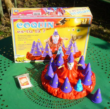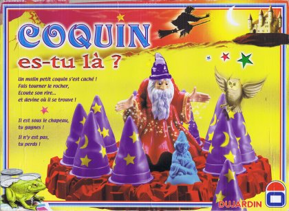 Le but, dans Coquin es-tu là ?, est de trouver trois fois le petit coquin. Pour cela, on essaye de réunir en main les bonnes cartes. Quand on a réussi, on peut tourner le manège. Le petit coquin, caché sous l'un des chapeaux, se met à rire quand le manège tourne. Cette « magie » est due à la présence dans le petit bonhomme d'une électronique astucieuse, d'un interrupteur sensible à la force centrifuge et à trois piles boutons que vous devrez soigneusement conserver, car elles risquent de vous coûter plus cher que le jeu. Quand le manège ralentit, le coquin arrête de rire. Il faut maintenant trouver où il se cache. L'idée est bonne, mais on n'y jouera pas toute la nuit non plus.
