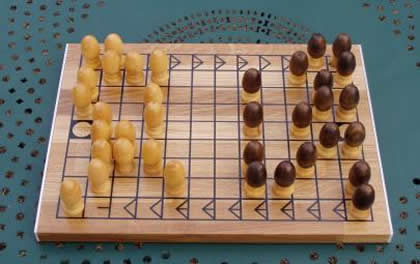 Le but est d'amener un œuf dans le nid adverse, la case centrale de la première ligne. Il est possible de prendre un œuf adverse en avançant simplement sur sa case. Le déplacement des œufs est quant à lui déterminé par la ligne où ils se trouvent au moment d'avancer. En ligne 1 et 2, il n'est possible que d'avancer tout droit, d'une case. En ligne 3 et 4, il n'est possible que d'avancer en diagonale, d'une case. Dès qu'un œuf atteint ou dépasse la cinquième ligne, ses possibilités sont largement augmentées. Il peut avancer tout droit ou en diagonale d'une case. Il peut aussi avancer plus rapidement, jusqu'à un nombre de cases déterminé par le nombre d'œufs sur sa ligne. Mais dans ce cas, il n'a ni le droit de prendre ni le droit d'entrer dans le nid. On assiste donc à une guerre de position et de rapidité. La subtilité du jeu vient du fait qu'un attaquant est beaucoup plus fort que son adversaire quand il pénètre ses lignes, puisqu'il peut avancer de trois façons alors que son adversaire en défense est limité à deux ou un seul mouvement. Les amateurs de jeux abstraits apprécieront à sa juste valeur Le Coucou picard, aussi beau qu'original et profond. |
