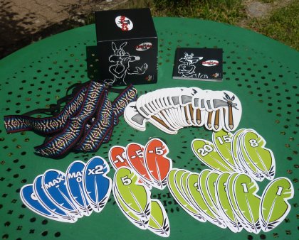 Vous n'avez maintenant plus aucune excuse pour repousser l'achat d'un des meilleurs jeux de l'année 2003 ! 2011 : Coyote chez GigamicAprès un petit tour chez Ravensburger, sous le nom de Pow-Wow, revoici Coyote dans une superbe édition comme sait les faire Gigamic. Les cartes ont été remplacées par des plumes, qui tiennent sur le front grâce à un joli bandeau tressé. Les jetons sont devenus de solides tomahawks.