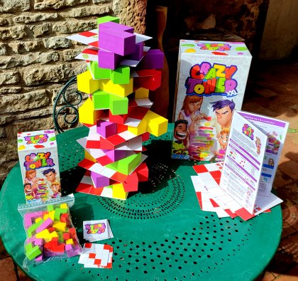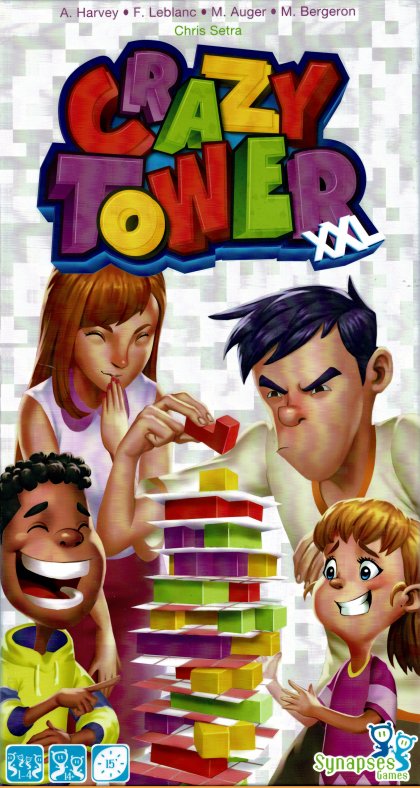 Si on ne se lasse pas de Crazy Tower, on se lasse encore moins de Crazy Tower XXL ! La boite, impressionnante, contient les mêmes blocs et les mêmes plateaux mais tout est beaucoup plus grand. On passe d'une section de 18 mm à une section de 45 mm, deux fois et demi plus grandes, quinze fois plus volumiques ! Pour éviter les fractures du pied en cas de chute incontrôlée de la tour, l'éditeur a opté pour des pièces en mousse.