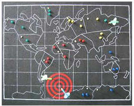 2006 : Première édition Dart Wars, contrairement à Risk dont il est clairement un descendant, est totalement dénué de hasard. En revanche, il faut faire preuve de pas mal d'habileté pour devenir le maître du monde. Les déplacements, comme les combats, sont entièrement réglés par des tirs de fléchettes. Autant dire que je n'ai aucune chance de gagner un jour à Dart Wars En admettant que les joueurs soient tous aussi habiles, le jeu devient tactique puisqu'il faut conquérir les pays les uns après les autres, pour arriver en force devant les adversaires. Une belle idée, qui bénéficie d'une édition soignée, avec des aimants particulièrement costauds. |