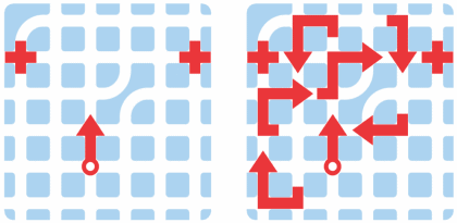 L'idée originale était de créer un jeu de recherche d'itinéraire, avec un personnage doté d'une position de départ et d'une position d'arrivée. Les déplacements du personnage seraient limités à quelques « instructions » utilisables une seule fois. Une instruction pourrait être : « Allez tout droit jusqu'à ce que votre chemin soit bloqué, puis tournez à gauche. » Le problème de ce concept était que les joueurs pouvaient facilement se tromper, car la gauche et la droite sont relatives à la position du personnage. C'est une notion qui pose problème non seulement aux enfants, mais aussi à de nombreux adultes. Je me souviens par exemple que ma femme devait toujours faire pivoter la carte lorsqu'elle me donnait des indications en voiture (avant l'arrivée du GPS). Pendant des années, j'ai exploré diverses pistes et j'ai finalement résolu ce problème en inversant le concept : au lieu de déplacer un personnage à l'aide d'instructions « virtuelles », j'ai rendu les instructions « physiques » et les déplacements du personnage « virtuels ».