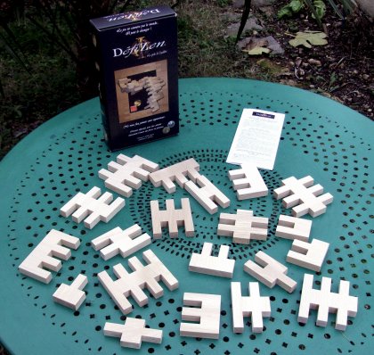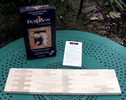 Défizen est composé de vingt pièces, toutes différentes. Le premier défi est de les ranger dans la boîte, en formant deux rectangles identiques et donc superposables. Heureusement, si vous êtes pris par le temps, l'auteur a prévu une boîte qui accepte les pièces mal rangées !