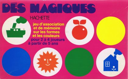 Dés magiques se compose de deux dés spéciaux et de trente-six cartes. Un dé montre six sujets : bateau, maison, soleil, pomme, escargot, papillon. L'autre dé montre six couleurs. Les cartes représentent les six sujets dans les six couleurs. Partant de ce matériel, l'auteur propose trois règles basées sur l'observation ou la mémoire.