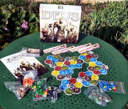 Deus est un jeu créé par Sébastien Dujardin, illustré par Christine Deschamps, Misda, Ian Parovel et Paul Laffond. Il est édité par Pearl Games et est disponible en boutiques spécialisées et en VPC depuis le 15 novembre 2014 pour environ 50 €. Deus se joue de 2 à 4 joueurs à partir de 12 ans et les parties durent en moyenne 60 minutes. C'est un jeu de gestion d’une civilisation antique où vous construisez des bâtiments, attaquez des villages barbares, etc. Votre but est d’être le joueur avec le plus de points de victoire (PV) à la fin de la partie.