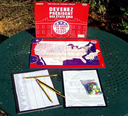 Pour devenir Président à la place du Président, il va falloir être habile aux dés, mais aussi faire preuve d'un peu de bon sens tactique. À votre tour, vous pouvez lancer un ou deux dés. Après quoi, vous affectez votre résultat à un état. Si le compte est bon, vous remportez l'état, sinon, vous notez vos points. On peut être plusieurs à briguer un état et seul le premier qui fera le compte exact (par exemple 21 pour l'Ohio) remportera cet état. En fait, une espèce de Yam’s à 51 cases sur la carte des USA. Bénéficierons-nous en 2008 d'une extension « grands électeurs » ? |