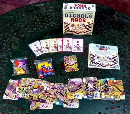 Dicycle Race est une distrayante course de vélos qui se joue à coups de dés sur un trajet constitué de cartes. Chaque carte porte trois indications :
