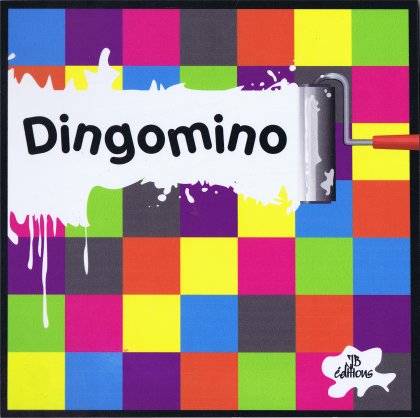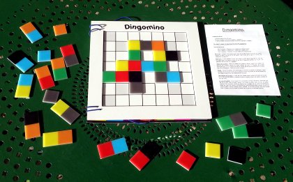 Dingomino se compose de 21 dominos de deux couleurs, de 7 carrés et d'un tablier de 7 × 7 cases dont les deux diagonales sont grisées. Plusieurs règles sont proposées, pour un ou plusieurs joueurs. C'est la règle pour plusieurs joueurs qui nous intéresse ici. L'idée directrice est de se débarrasser le premier de ses pièces. À son tour, le joueur actif doit poser une de ses pièces en respectant les contraintes : une couleur ne peut-être présente qu'une seule fois sur chaque colonne, sur chaque ligne et sur chaque diagonale. Facile en apparence, mais on se trompe facilement, croyez-moi ! Quand on le souhaite, généralement quand on ne peut pas jouer un domino, on peut poser son carré, reçu en début de partie et gardé secret jusqu'ici. Un placement judicieux peut considérablement gêner les adversaires.