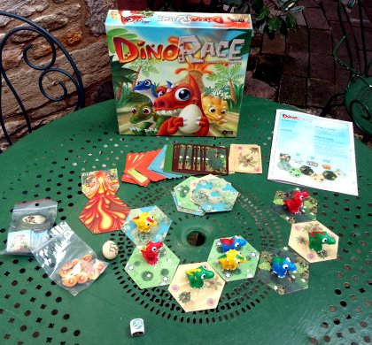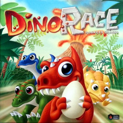 Dino Race est un jeu de course pour jeunes stratèges. Chacun contrôle deux dinosaures qu'il va s'efforcer de faire fuir sur le piste à l'aide des cartes qu'il a en main, en essayant d'éviter la lave du volcan. Le souci, c'est qu'il faut aussi sauver l'œuf. Et que celui qui le transporte est un peu gêné dans sa course. Quand le volcan se réveille, il perd tous ses moyens, et en concurrence, toutes ses cartes ! Mais s'il parvient à fuir en possession de l'œuf, il va toucher le gros lot. Le jeu se déroule classiquement : on pose des cartes, on résout leurs effets puis on jette un dé d'événement. Un joueur qui n'est pas satisfait des cartes qu'il a en main a deux possibilités. Il peut défausser deux cartes de son choix pour en tirer une nouvelle qu'il espère plus adaptée. Il peut également jouer trois cartes de même type qui valent un joker. Il faut surtout prendre garde de ne pas stationner sur la même case qu'un adversaire vindicatif qui pourrait vous jouer de mauvais tours s'il lui en prenait l'envie et s'il avait en main une carte adéquate. Rien de bien nouveau, mais un matériel étonnant avec des dinosaures très kitsch et peints à la main par des ouvriers probablement syndiqués.