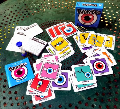 Djumble, ce sont six jeux différents qui utilisent tous le même système : un ensemble de cartes décrivant des caractéristiques. Celles-ci peuvent porter sur la forme, l'aspect, la couleur, la fragilité, la matière, la rareté, la taille, le poids, etc. L'idée commune aux six mini-jeux présentés dans la règle est de trouver dans la maison des objets correspondant aux caractéristiques de ces cartes. On pense un peu à Ein solches Ding (malheureusement jamais publié en français - ou Laoupala. Mais le jeu est cependant assez différent.