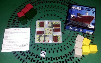 À tour de rôle, les joueurs de Docker doivent lancer le dé, puis déplacer une de leurs pièces du nombre de cases indiqué. Au début, rien de plus facile. Mais quand on avance dans la partie, le terrain devient encombré, et les possibilités se restreignent. La place au sol est réduite à neuf cases, sur lesquelles douze pièces essayent de se placer. Toute la tactique consiste à gérer ses libertés. Plus les pièces peuvent bouger, plus le joueur peut tirer parti de n'importe quel tirage de dé. Facile à dire, un peu moins à réaliser, d'autant que les adversaires ne se privent pas de vous enquiquiner en bloquant vos pièces. On pourrait regretter que le hasard intervienne dans Docker. Il est cependant tout à fait possible d'envisager une variante sans aucun aléa, en remplaçant le dé par six cartes identiques attribuées à chaque joueur (je suis sûr que vous trouverez des cartes numérotées, en cherchant un peu dans votre armoire à jeux). Le tour consiste alors à choisir une carte, puis à déplacer une pièce. Ce n'est qu'après avoir joué ses six cartes qu'on peut les reprendre en main.