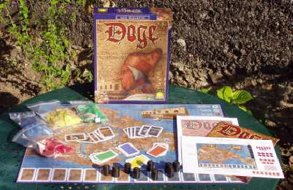 On va ensuite résoudre les majorités dans les quartiers. Être premier permet de construire des maisons et de disposer d'un conseiller, qu'on peut envoyer dans un autre quartier où il comptera pour un point. Au bout d'un petit moment, les quartiers sont encombrés de conseillers, de jetons, de maisons et de palais, et on finit par ne plus rien voir du tout. La confusion règne. On regrette alors la beauté du jeu, qui le rend en fait totalement illisible. Les conseillers sont par exemple marqués d'un symbole, dont on pourrait croire qu'il n'a pour but que d'être confondu avec un autre. Plusieurs fois dans la partie, on se rend compte que le pion qu'on croyait dans un quartier était en fait dans un autre, que le pion dont on a pris possession est en fait celui d'un autre joueur etc. Tout ça pour arriver à une situation finale où tous les joueurs arrivent au but pratiquement en même temps. C'est alors qu'un joueur va décider lequel de ses adversaires sera vainqueur, en misant ici plutôt que là. un jeu très intelligent, trop sans doute, qui plaira aux amateurs de calculs complexes. La phrase à retenir : « Alors, tu joues, oui ? ». Chez nous, Doge a plutôt provoqué l'ennui et ne ressortira pas souvent. Un plan de jeu plus synthétique, et donc plus facile à lire, aurait certainement valu au jeu une appréciation bien meilleure. En jeux de majorité, on préférera nettement El Grande et San Marco. |