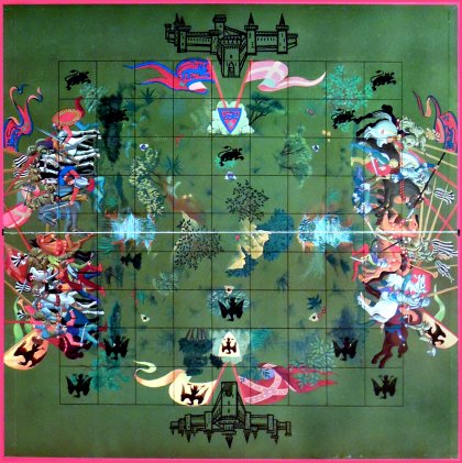 Quelques précisionsAprès avoir contacté l'auteur, Max Gerchambeau, je suis en mesure d'apporter quelques précisions supplémentaires. Sur la règle du jeuUne précision importante qui manque à la règle originale : les prises s'effectuent en sautant comme aux dames, que l'assaillant soit un chevalier ou un simple soldat. Il est possible, pour un chevalier, d'approcher en sautant un ou plusieurs pions de son camp, puis de prendre une ou plusieurs pièces adverses en continuant à sauter. Les pions qui arrivent en dernière ligne ne peuvent plus avancer. Ils ne sont pas promus, comme aux dames mais peuvent se déplacer latéralement pour essayer d'occuper la citadelle adverse. Sur le tablierIl a été dessiné par des étudiants allemands qui travaillaient sur les décorations des Galeries Lafayette. Le dessin a été réalisé en « paiement » des repas qu'ils prenaient chez l'auteur, qui tenait un restaurant vers le Champ de Mars à Paris !