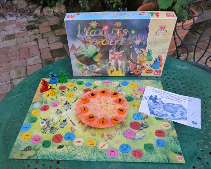 L’École des sorcières est un jeu de parcours et de mémoire. Le dé indique la prochaine couleur de case à rejoindre. Mais pour y rester, il faudra retrouver, parmi les 10 jetons face cachée, celui qui correspond à cette case. Rien de bien nouveau mais un matériel de jeu agréable.