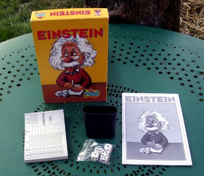 Si vous persévérez et ouvrez la boîte, vous découvrez qu'il s'agit d'un jeu de « Sid Jackson » (sic). En fait, Einstein est un concentré de jeu intelligent, dans lequel le hasard occupe finalement peu de place (sauf si vous perdez). À chaque tour de jeu, on jette cinq dés, puis chacun décide comment il inscrit ces dés sur sa feuille. Il faut additionner deux dés pour former un total de 2 à 12, et deux autres dés pour former un second total (qui peut être le même). On coche alors une case sur la ligne correspondant à chacun de ces totaux. Le cinquième dé est affecté à la colonne 5, qui sert un peu de temporisateur. Trois valeurs sont possibles pour chaque joueur, et dès qu'une de ces trois valeurs a été inscrite huit fois, la partie est terminée pour le joueur.