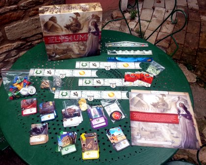 Elysium est un jeu de combinaison de cartes, réalisé par Matthew Dunstan et Brett J. Gilbert, et illustré par Cari, Didier Poli, John McCambridge, Emmanuel Roudier, Vincent Dutrait, Eric Bourgier, Sylvain Guinebaud, Bruno Tatti et Pascal Quidault. Les joueurs incarnent des demi-dieux ambitieux qui cherchent à entrer dans la légende en rassemblant des artefacts et accomplissant des quêtes héroïques. Le jeu est édité par Space Cowboys. Elysium est disponible en boutiques spécialisées et VPC depuis le 20 février 2015 pour environ 45 €. Il se joue 2 à 4 joueurs à partir de 14 ans et les parties durent en moyenne une heure (tout dépend du nombre de joueurs autour de la table et du temps de réflexion de chacun). Le but est d’avoir le plus de Points de Victoire (PV) à la fin de la partie et des cinq époques qui la composent. L'Avis de JohanElysium, comme Loony Quest, fait partie de mes gros coups de cœur ludiques de ce début d’année 2015, même s’ils ne jouent pas dans la même catégorie. Ici on plonge dans l’Antiquité et la mythologie grecque et on se retrouve dans la peau d’un demi-dieu qui veut entrer dans la légende. Les règles du jeu sont plutôt simples et assez faciles à expliquer, ce qui n’empêche pas le jeu d’avoir une belle profondeur, qui vous demandera de faire des choix. Ces derniers pourront s’avérer payants ou non, selon les stratégies de vos adversaires. Elysium fait partie de ces jeux que j’affectionne et dans lesquels il n’y a pas une seule stratégie à adopter pour gagner. Une stratégie payante lors d’une partie précédente pourra s'avérer complètement improductive lors de la partie suivante. Ce genre de jeux dispose donc d’une très belle rejouabilité en temps normal et ici c’est encore plus fort, puisqu’il y a au total 8 familles de cartes et qu’on n’en utilise que 5 à la fois. Il y a donc de nombreuses possibilités de mélange, rendant les parties différentes à chaque fois. De plus, le nombre de cartes présentes fait qu’il faudra plusieurs parties avant de voir toutes les cartes d’une même famille puis de parvenir à les optimiser. Bien évidemment, comme il s’agit d’un jeu à base de cartes, il y aura toujours une part de chance. Certaines cartes qui vous intéressent pourront ne jamais voir le jour en cours de partie. Sans compter que vos adversaires peuvent se faire un malin plaisir de vous souffler une carte afin de faire capoter votre belle légende. C’est d’ailleurs là que réside toute la complexité du jeu : parvenir à établir des stratégies, garder les colonnes nécessaires à l’obtention des cartes ou quêtes qui nous tentent, etc. tout en sachant que vos adversaires convoitent peut-être les mêmes. Vaut-il mieux privilégier la quête n°1 pour être sûr de jouer en premier par la suite ou s’emparer de la carte qu’il faut pour compléter une légende, au risque d’être dans les derniers à jouer ? Il vous faudra donc toujours vous adapter et faire preuve d’opportunisme en sautant sur les bonnes occasion lorsqu’elles se présentent à vous, quitte à changer complètement de cap au niveau de votre stratégie. Les pouvoirs des cartes sont variés et permettent de faire de jolis combinaisons. Le guide des cartes est d’ailleurs très plaisant, puisqu’en plus d’expliquer en détail le fonctionnement de ces dernières, il nous apprend également des éléments intéressants sur la mythologie, les personnages, etc. présents sur la carte. Se cultiver tout en jouant, c’est toujours un régal et un petit plus bien sympathique. Je tiens également à tirer un coup de chapeau aux Space Cowboys qui ont eu la bonne idée de faire appel à de nombreux illustrateurs très talentueux, dont certains issus du monde de la BD (en fan de BD que je suis, ça ne pouvait que me faire plaisir Cela peut semble anodin, mais c’est vraiment un très gros plus du jeu puisque ça permet de renforcer le fait que chaque famille à un style de jeu différent, ça peut également éventuellement permettre à certains joueurs d’essayer de jouer par affinité graphique (ou couleur de famille). Donc voilà chapeau bas à Cari, Didier Poli, John McCambridge, Emmanuel Roudier, Vincent Dutrait, Eric Bourgier, Sylvain Guinebaud (dont je suis super fan du travail que ce soit en BD ou ailleurs !), Bruno Tatti et Pascal Quidault, tous ces illustrateurs super talentueux qui ont su rendre à merveille l’ambiance de l’époque et nous permettent de nous immerger sans problème dans l’antiquité et la mythologie grecque. Le thermoformage de la boîte est une fois de plus très joli (après le magnifique thermoformage de Black Fleet en forme de crâne) puisqu’il représente un temple grec ! L’espace pour les cartes a également été prévu afin que vous puissiez protéger vos cartes. Néanmoins je le trouve moins pratique que leurs thermoformages précédents, il n’est pas vraiment intuitif et je ne sais donc pas si j’ai mis les éléments aux endroits où ils sont supposés être. Bien que l’emplacement des cartes soit prévu pour qu’elles soient protégées, il est ensuite assez difficile de les en sortir, sans enlever le thermoformage afin de les pousser par en-dessous (mais bon c’est peut-être moi qui ne les ai pas mises au bon endroit dans la boîte). Comme pour Deus, je regrette également qu’il n’y ait pas un petit calepin de score dans la boîte, afin de faciliter le comptage de points en fin de partie et pouvoir en garder une trace. Hormis ces petits points de détail, le jeu est vraiment nickel chrome avec du matériel d’excellente facture qui tient bien le coup. En bref, Elysium est un excellent jeu, facile à prendre en main mais néanmoins très riche au niveau des possibilités de victoire, des combinaisons de cartes et des stratégies à adopter en cours de partie. Les illustrations avec des pattes graphiques différentes sont de toute beauté, permettan