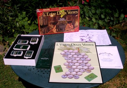 L’Entre deux verres propose un minuteur assez original : une bouteille de vin, que l'on boit verre après verre et dont la fin marque l'issue de la partie. Pour les moins assoiffés, il est possible de jouer avec une bouteille factice, dont on prélève les éléments un à un. L’Entre deux verres est un mélange de divers mécanismes : collecte, questions de connaissances, défis. Pour gagner, il faudra un minimum de connaissance sur les crus français et étrangers — car il paraît qu'à l'étranger on fabrique aussi quelques vins.