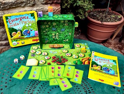 La grande originalité de Escargots… Prêts ? Partez !, c'est la piste de course si passe par la boîte de jeu. Les escargots, collés sur un aimant, montent sur la première paroi, parcourent le haut de la boîte et redescendent doucement par l'autre paroi avant de rejoindre le podium d'arrivée. Chaque joueur a une carte d'objectif secret indiquant les trois escargots qui lui rapporteront 3, 2 ou 1 points s'ils arrivent sur la première, la deuxième ou la troisième marche du podium. Après avoir lancé les deux dés, le joueur actif choisi l'un des deux dés et avance l'escargot de cette couleur sur la prochaine case de la couleur du second dé. Un escargot peut monter sur un autre gastéropode, sauf en montée ou en descente. Cela empêche momentanément l'escargot du dessous d'avancer. Belle réalisation pour un jeu auquel les parents et grands parents joueront volontiers tant il est beau.