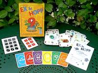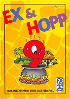 Ex & Hopp est un jeu réservé aux méchants. Le but du jeu est de marquer le plus de points possible. Dans les faits, le moyen d'y parvenir est surtout d'en faire gagner le moins possible aux adversaires. La partie se joue en trois manches. Pour chaque manche, on tirera 4 jetons d'objectif. Le nombre indiqué sur le jeton indique à la fois le nombre de cartes qu'il faudra poser avant d'en déterminer le gagnant, et la valeur du gain. Oui mais voilà : les jetons rouges sont négatifs ! Une fois les enjeux déterminés, chaque joueur pose une carte à son tour en face d'un des jetons. On peut poser une carte de sa couleur mais aussi, le plus souvent, une carte d'une autre couleur. Un principe repris depuis dans de nombreux autres jeux, mais qui provoque toujours d'amusantes tensions autour de la table. |