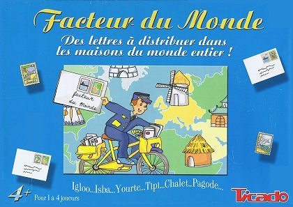 Facteur du monde est un Loto avec une toute petite part de décision. À son tour, le joueur lance les deux dés et place une lettre sur la case déterminée par ces deux dés : forme et couleur. Par exemple, la case avec un triangle rouge. Lorsque la face d'un dé est neutre, le joueur en choisit librement la valeur. Si les deux faces sont neutres (tous les 36 du mois, donc), il est totalement libre du choix de sa case. Le but est d'obtenir une ligne verticale, horizontale ou diagonale de cinq cases livrées. Le jeu est surtout l'occasion, pour le jeune joueur, de découvrir la variété des maisons du monde.