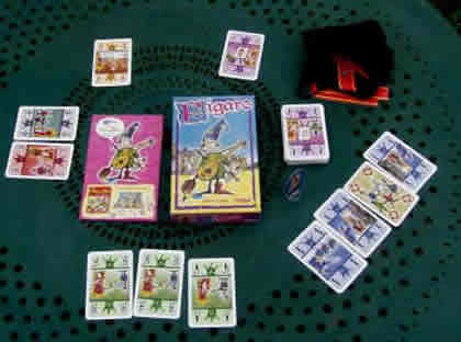 Figaro est curieusement disponible en France sous deux formats. Tilsit l'a édité en version française et en format de poche, tandis que Da Vinci l'a édité en format un peu plus grand et en six langues, diffusé en France par Ludiquement Vôtre. Quelques légères différences de présentation, mais au final un jeu strictement identique. Je ne suis pas sûr que le consommateur bénéficie au final de cette auto-concurrence. Figaro est un jeu de levées, mais ce seront généralement les adversaires qui vous en feront faire, car il est souvent malvenu d'en faire. En effet, à l'issue de chaque manche, le joueur qui a ramassé le plus de cartes prendra le plus grand tronçon de chemin et ça, c'est fortement déconseillé… Deux cartes viennent mettre un peu de panique dans ce qui est au final un vrai jeu d'enfoirés. Le Joker est très important, car il peut être posé pour n'importe quelle couleur. La Farandole, qui n'est pas joyeuse pour tous, fait tourner les mains. Pour gagner, un peu de chance et pas mal de fourberie seront nécessaires. Et, comme d'habitude dans ce genre de jeu, il faut se méfier comme de la peste du joueur le plus discret. |