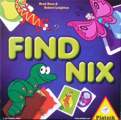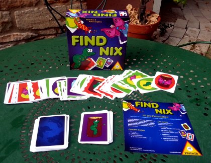 Une carte est posée sur la table et le joueur dont c'est le tour doit trouver dans son jeu une autre carte qui présente deux ou trois caractéristiques identiques. S'il trouve une carte avec deux caractéristiques identiques, il la pose et c'est maintenant le tour du joueur suivant. S'il trouve une carte avec trois caractéristiques, il peut rejouer sans y être contraint. Et s'il ne trouve rien, il doit piocher. Le premier joueur qui s'est débarrassé de toutes ses cartes gagne la manche et autant de points que le nombre de cartes chez celui qui en possède le plus. Le premier qui atteint un score donné gagne la partie. Trop compliqué pour les jeunes joueurs, trop hasardeux pour les plus âgés, Find Nix ne convainc pas vraiment. Au fait, quatre-vingt-une cartes avec 4 caractéristiques triples, ça ne vous rappelle rien ? Même pas Set ? Effectivement, on peut jouer à Set avec une boîte de Find Nix, ou à Find Nix avec une boîte de Set.