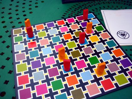 Le souci, avec le jeu original, c'est que plusieurs couleurs sont très semblables et trompeuses. Vous trouverez en tête de présentation un lien vers un tablier alternatif que je vous propose de télécharger et d'imprimer. Finesse fonctionne assez bien, du fait de l'importante taille du tablier et du faible nombre de pions qui y circulent. Il est ainsi assez aisé de préparer discrètement un alignement que l'adversaire ne pourra pas parer. À moins qu'obnubilé par vos plans, vous n'ayez pas vu que votre opposant atteignait son but avant vous !