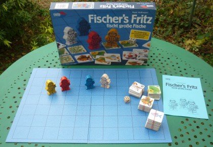 Fischer’s Fritz fischt große Fische est plus difficile à prononcer qu'à jouer. L'idée générale est de partir à la pêche en avançant tout droit, du nombre de cases indiqué par le dé. Si on tombe sur un gros poisson ou un objet, on le pêche et il rapportera des points en fin de partie. Si on trouve des petits poissons, du menu fretin, il faut le laisser. Tout l'art consiste à tomber sur une plante. Elle permet de rejouer, et surtout elle autorise à ne pas utiliser la totalité des points : on peut donc s'arrêter sur une case intéressante. D'accord, c'est un jeu pour les petits, mais il y a quelques décisions à prendre et le matériel est très mignon. Alors craquons, et jouons avec eux !