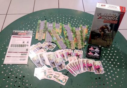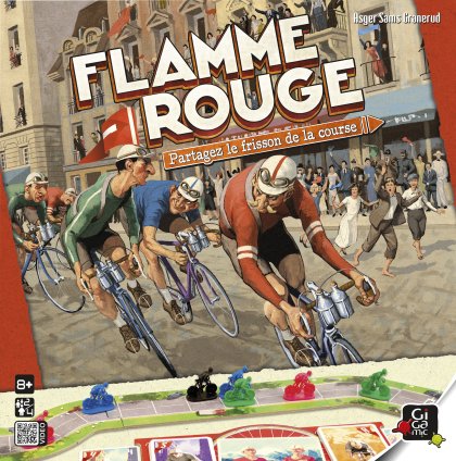Difficile de faire du neuf dans les jeux sur le thème du cyclisme. On compte déjà plusieurs très bons jeux sur ce thème : Maillot Jaune, L’Échappée, … Un jeu de course cycliste, Um Reifenbreite, a même remporté le prestigieux Spiel des Jahres en 1992. Flamme rouge n'arrive donc pas en terrain neuf. Se faire une place implique d'être original et intéressant. Ça tombe bien : Flamme rouge répond aux deux impératifs. Le jeu exploite particulièrement bien le mécanisme d'aspiration. Pour gagner la course, il vous faudra utiliser au mieux le peloton en évitant de fatiguer vos joueurs. Chacun essaye de conserver de bonnes cartes pour le sprint final, mais tenter une échappée peut s'avérer payant. En fait, il manque une phase dans le jeu : celle de la concertation pour combiner des échappées communes avec un allié de circonstance. Rien ne vous empêche de l'ajouter discrètement. La règle tient sur quatre pages bien illustrées. Il est possible de bien jouer dès 8 ans ce qui en fait un bon jeu à la fois familial et agréable aux joueurs chevronnés. Les illustrations sont splendides, ce qui est un plus apprécié.