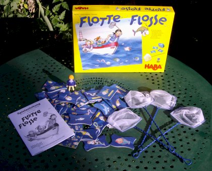 Flotte Flosse (La pêche à l'épuisette) est un amusant jeu d'observation rapide pour les jeunes joueurs et pour tous ceux qui se sentent encore jeunes (ainsi que les marins pêcheurs qui ont dépassé leurs quotas). L'idée est d'attraper le premier la carte correspondant au poisson qu'on vient de retourner. Mais parfois, le poisson montre les dents et il ne faut surtout pas l'attraper. D'autres fois, c'est le capitaine Ole qui apparaît et il faut attraper sa figurine (la mienne ayant disparu, je l'ai remplacée par un joli playmobil). Le matériel est sympathique et donne envie de jouer. Les illustrations de Anja Dreier-Brückner n'y sont pas pour rien. |