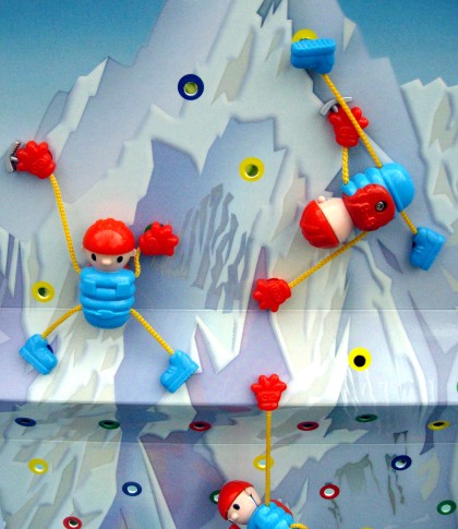 Une roue indique quel trou vous pouvez occuper. La prudence conseille de toujours s'accrocher à la roche par au moins trois appuis, mais vous pouvez prendre des risques si vous êtes insensé. Pendant ce temps-là, votre adversaire grimpe de l'autre côté. Il peut utiliser une de vos prises, ce qui n'est pas dramatique… sauf s'il s'agissait de votre dernière prise !