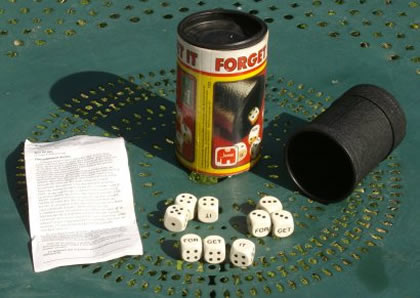 La règle coule de source : il s'agit de marquer des points en rejetant autant de fois les dés qu'il semble nécessaire, mais en conservant toujours les faces écrites. Si la phrase « FORGET IT » apparaît suite à un tirage, vous avez tout perdu. Il faut donc s'arrêter à temps. Un jeu que l'éditeur lui-même, en choisissant le titre, nous conseille d'oublier. |