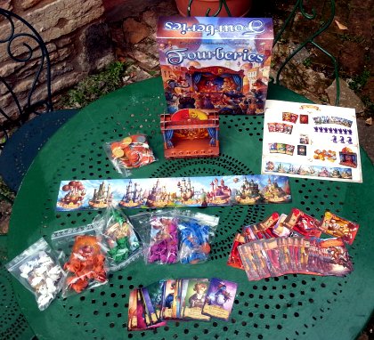 Fourberie : « Caractère fourbe, disposition d'une personne à tromper autrui par des ruses perfides, odieuses. » Fourberies porte bien son titre : ici, les manœuvres ne viennent pas principalement des acteurs ou des personnages qu'ils incarnent, mais des saltimbanques qui peuvent totalement changer la physionomie de la partie. Les parties, rapides, se jouent en deux manches à l'issue desquelles on attribuera des points aux joueurs qui auront proposé le meilleur spectacle correspondant à l'humeur du roi : comédie ou tragédie. Et justement, on ne sait pas vraiment quelle sera l'humeur du roi. D'autant plus que tous les joueurs autour de la table n'en ont pas forcément la même idée. En défaussant des acteurs, on peut modifier l'humeur du roi mais alors on se prive justement de ces acteurs. D'où le dilemme. Et les saltimbanques, dont on parlait plus haut, peuvent totalement chambouler la partie par leurs ruses. Amusant, rapide et facile à expliquer. Même quand on y joue une tragédie, il n'est pas rare d'entendre des rires autour de la table.