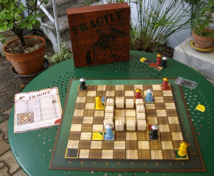 Fragile est sans grande difficulté un des plus beaux jeux de ma collection. Comme Maîtres voleurs du même auteur, le jeu est présenté dans un coffret de bois, et on n'est pas déçu en ouvrant la boîte.