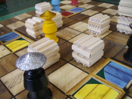 Finies les 35 heures ! À votre tour de jouer, vous déplacez vos manutentionnaires, mais vous pouvez aussi mettre à contribution les ouvriers adverses, s'ils sont bien placés, afin qu'ils fassent la chaîne pour transporter une caisse. Très tactique à deux joueurs, Fragile ne présente pas un grand intérêt à quatre, lorsque chacun joue pour soi, car la moindre planification est vaine. Il faut bien sûr y jouer en équipes, et le jeu trouve tout son piment. |