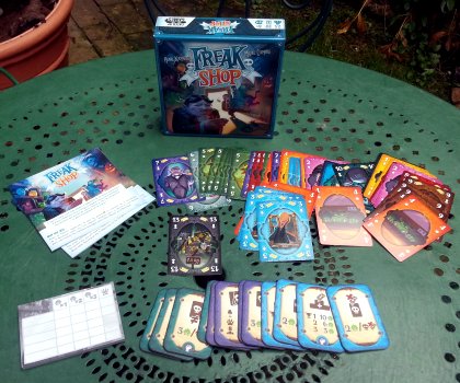 Freak Shop est un jeu de collecte et de combinaison. Vous essayez de récupérer les cartes les plus intéressantes en fonction des trois objectifs affichés parmi douze possibles. À chaque tour, vous pouvez échanger soit X cartes d'un type contre X cartes d'un autre type (généralement de plus grande valeur) soit des cartes d'une valeur totale de X contre d'autres cartes d'une valeur totale identique. Le but est d'embellir peu à peu vos acquisitions. La fin de la partie intervient de manière un peu aléatoire ce qui peut parfois avoir un effet pervers. Lorsqu'il ne reste plus qu'une ou deux cartes à piocher, le dernier joueur a en effet la certitude que personne ne jouera après lui ce qui lui confère un avantage important. C'est le seul petit défaut que je trouve dans ce jeu par ailleurs très agréable et joliment illustré.