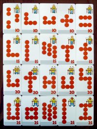 L'image de gauche représente les vingt cartes du jeu ; la seule contrainte est de les reproduire à une taille suffisante pour que les dés tiennent sur les cercles rouges. La taille originale est de 82 × 140 mm. Si vous êtes piètre dessinateur, vous pouvez télécharger l'image en grande définition visible à gauche sur BoardGameGeek