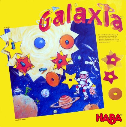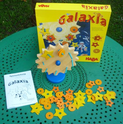 Après s'être équitablement réparti les étoiles et les planètes, les joueurs de Galaxia vont essayer d'en gagner le plus grand nombre possible. Le tour d'un joueur consiste à choisir trois pièces, puis à les donner à son voisin de gauche en désignant l'axe où il devra les accrocher. Son voisin devra agir avec minutie, car tout ce qui tombera s'ajoutera aux gains du donneur d'ordre. Une variante consiste à poser soi-même les pièces et, dans ce cas, tout ce qui tombe fait perdre des points. L'intérêt de Galaxia réside surtout dans le très beau matériel de jeu, avec en particulier une grosse roue qui tourne vraiment facilement sur son axe en polyamide 6-6