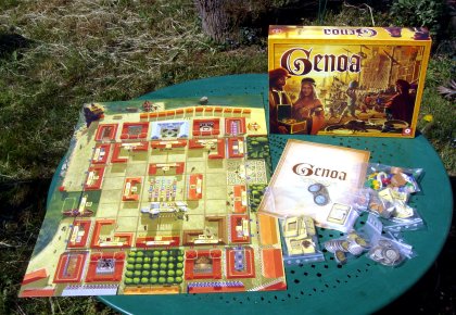 Les possibilités sont très (trop ?) nombreuses : achat, échange et vente de marchandises, portage de courrier, prise de possession de bâtiments, achats et utilisation de pouvoir spéciaux, accumulation de cartes, petites et grosses commissions etc. La plus grande confusion règne rapidement, et il est difficile de s'y retrouver. Le problème, c'est que si les choix sont importants en nombre, il est pratiquement impossible de maîtriser quoi que ce soit. Nous avons joué à 5, et il semble que ce nombre de joueurs soit trop important, car les possibilités de chacun sont très réduites. On a l'impression de se laisser porter par le hasard, en espérant que l'adversaire ira dans la boutique où l'on doit déposer un pli ou effectuer une livraison. Parfois, le sort est favorable. Mais il peut s'acharner sur vous pendant un très long moment. La tactique que j'ai essayée s'est avéré payante, puisque j'ai gagné. Mais elle consistait à ne rien faire, en regardant les autres courir après une activité souvent vaine et coûteuse. Il vous faut donc choisir entre vous amuser ou gagner ! Ce qui est un peu dommage, avouons-le. Le jeu n'est donc pas indispensable. La réalisation est très soignée, mais la complexité de mise en œuvre nécessite plusieurs parties pour maîtriser les mécanismes. Il lui manque la simplicité qui fait la qualité des grands jeux. Die Händler von Genua est donc réservé aux amateurs de jeux de commerce longs et complexes, ainsi qu'aux collectionneurs qui ne supportent pas qu'il manque le jeu no 6 dans leur collection de jeux Alea ! 2008 : Genoa en édition françaiseOn en parle bientôt…