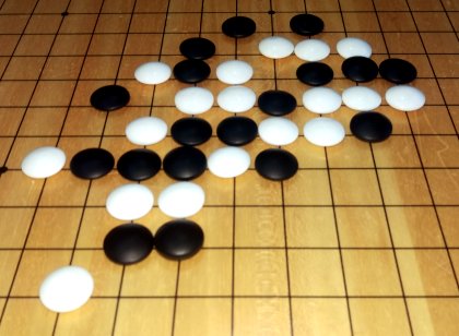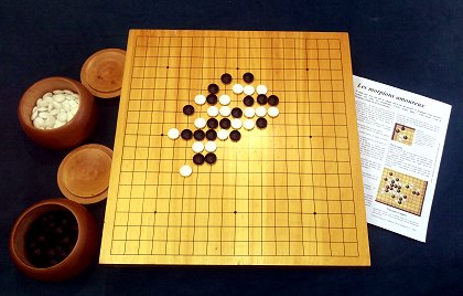 Le classique Morpion ne présente que peu d'intérêt. Il a rapidement été supplanté par une version un peu plus élaborée, Pente, où l'on gagne soit en alignant 5 pions, soit en capturant 10 pierres adverses avec une prise par encadrement. Les plus exigeant jouent au Renju, forme très élaborée où l'avantage du premier joueur est compensé par plusieurs contraintes auxquelles le second joueur n'est pas tenu. Vincent Everaert nous propose, avec Les Morpions amoureux, une expérience intéressante : au lieu de poser un pion à tour de rôle, chaque joueur doit poser d'abord un pion de sa couleur, puis un second pion de la couleur adverse dans l'une des huit cases autour du premier pion. Attention de ne pas finir vous même une ligne adverse ! Le principe, très intéressant, rappelle un peu celui du Par : 5 de Serge Bouquet, que Vincent Everaert cite d'ailleurs dans la présentation de son jeu Les Morpions amoureux, publiée dans la revue Tangente Jeux & stratégie n°18.