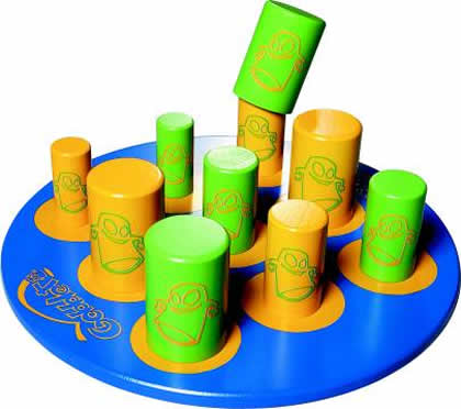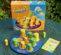 Le nombre de pièces et la taille du tablier de jeu ont été diminués. Chaque joueur possède ici 6 pions ou gobelets de 3 tailles, emboîtés les uns dans les autres. Le but devient d'aligner 3 pions au lieu de 4, puisque le tablier ne fait plus que 3 cases sur 3 cases. Par ailleurs, les pièces sont joliment colorées. Le reste des règles est inchangé. Mais pourquoi ce jeu serait-il réservé aux seuls enfants ? Il est tout aussi passionnant que son aîné et même plus incisif, car les parties sont nécessairement raccourcies, et la moindre faute d'attention est immédiatement sanctionnée. D'ailleurs, je ne suis pas sûr de préférer la version prévue pour les adultes sérieux… et un peu tristes.