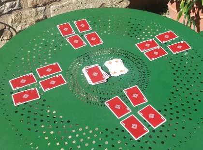 Golf est un jeu de cartes traditionnel, parfois appelé poker polonais. Deux à quatre joueurs s'affrontent en 9 manches, ou trous, l'idée étant de marquer à chaque trou le moins de points possible. Les points d'un joueur sont ceux des valeurs de ses cartes. Chacun va donc s'efforcer, par le biais de pioches et de remplacements, d'améliorer ses points. Lorsqu'un joueur pense être bien placé, il met fin à la partie. les adversaires ont alors un dernier tour puis on compte les points. Les plus valeureux peuvent jouer avec plus de cartes ou en 18 manches ou trous. |