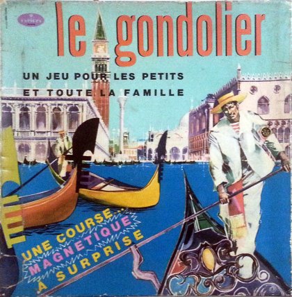 Le Gondolier est plus une curiosité historique qu'un jeu véritablement passionnant. L'idée, c'est que quand une gondole arrive sur une case marquée d'une pastille jaune, elle tourne dans l'une des quatre directions selon les aimants placés dans le tablier et dans le socle de la gondole.