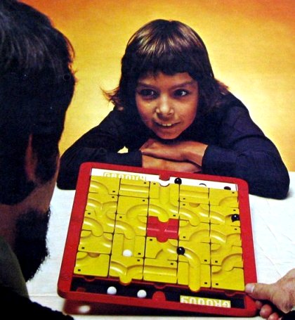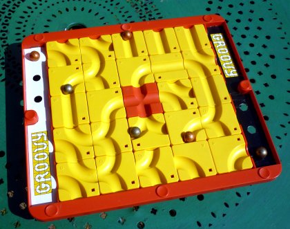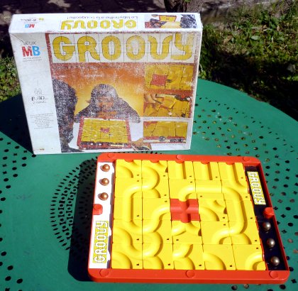 Comme l'indique son nom, Groovy est basé sur la gravitation universelle. Si l'aspect fait un peu penser à Meander, la règle en est cependant très différente. Le but est de rapatrier le premier ses trois billes. Pour cela, on joue en deux phases. D'abord, on tourne une des tuiles, puis on désigne un des huit points cardinaux à son adversaire qui doit appuyer dessus jusqu'à ce que le tablier touche la table. C'est là que ce situe la limite de Groovy : selon la façon d'appuyer, en guidant plus ou moins le tablier dans l'orientation désirée, on peut amener la bille à un emplacement pas du tout désiré. Si l'on décide que c'est le joueur actif qui doit appuyer sur le point, on observe le même défaut en sens inverse. En fait, il n'y a pas vraiment de solution, sauf à s'équiper d'un robot qui n'aurait été programmé par aucun des deux joueurs !