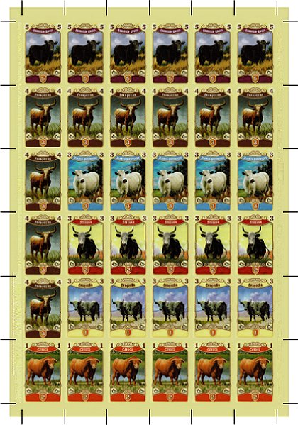 2022 : Vignettes pour le marché aux bestiauxLes règles permettent de consulter à tout moment sa défausse, mais jamais sa pioche. Comme on ne se souvient pas forcément toujours des vaches qu'on a déjà achetées, une telle consultation est parfois utile pour éviter des achats inutiles. Je vous propose d'imprimer, de plastifier et de découper proprement, des vignettes de rappel que vous trouverez à la suite des règles. Lors de la mise en place du marché initial, puis à chaque nouvelle introduction de bestiaux dans l'offre, placez les vignettes correspondantes sur les cartes. Laissez les autres vignettes à côté de la pioche des cartes bestiaux. Lorsqu'un joueur achète une ou plusieurs vaches, il prend en même temps les vignettes correspondante et les place près de son plateau pour rappeler quelles vaches il a déjà achetées. Il est aussi possible de placer ces vignettes sur les cartes d'objectif pour savoir facilement quelles vaches on a déjà achetées. Les vignettes qui restent à côté de la pioche permettent de savoir quelles vaches sont encore dans cette pioche, un renseignement particulièrement utile quand on envisage d'employer un cowboy pour ajouter deux vaches au marché.