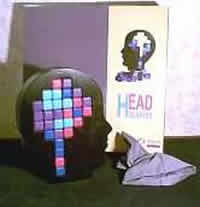 C'est pourtant ce qu'on pourrait croire ! Garder le jeu en équilibre est parfois un jeu dans le jeu, tant l'ensemble est instable. La fabrication est malheureusement imparfaite, et de nombreux éléments se décollent. C'est dommage, car le jeu est réellement intéressant. Dans une tête en bois épais, des « bi-cubes » viennent s'insérer. Chaque cube peut être d'une couleur différente. Les bi-cubes peuvent être introduits selon l'un des trois axes possibles, et chaque joueur ne peut observer qu'un côté de la tête. Le but du jeu est de faire les plus grands aplats de couleur possibles, sachant qu'une surface va rapporter le carré de sa taille. Ainsi le pentamino entièrement bleu clair visible sur la photo rapportera 25 points, tandis que le domino de même couleur ne rapportera que 4 points. Comme pour tous les jeux Theta, la présentation est superbe, à la limite entre le jeu et l'objet artistique. |
