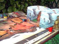 Régis m'avait donné la règle à Besançon, et sa lecture m'avait déjà plu. Le jeu semblait assez varié, avec assez peu de règles, et une logique générale cohérente. Dès que le jeu a été mis en libre service (merci Régis), j'ai profité de ma liaison haut débit pour charger les 16 Mo de données, permettant de recréer le jeu à la maison. Après quoi, je me suis muni de colle, ciseaux, papier, carton, bristol, cutter, sparadrap etc., et au boulot. Après avoir peiné quelques heures devant ma planche à découper, je me retrouvais enfin en possession de mon exemplaire de « Marchands d'empire ». Il ne restait plus qu'à y jouer ! Ce qui fut fait dès le lendemain, avec trois pauvres cobayes dont deux totalement débutants en jeux de société. Vous me croirez si vous voulez : le jeu a plu à tout le monde, joueurs expérimentés et novices. La phase d'apprentissage n'a pas été trop longue, et dès le troisième tour, sur douze, chacun avait parfaitement compris ce qu'il fallait faire. Les mécanismes du jeu sont assez simples à comprendre. Certaines villes fabriquent des ressources, d'autres proposent des contrats utilisant ces ressources. Il faut aller chercher les ressources, et ensuite aller avec ces ressources réaliser les contrats. Après les avoir réalisés, vous pouvez créer une église, implanter des électeurs ou vous en mettre plein les poches. En fait vous pouvez réaliser deux des trois possibilités décrites. Le jeu fonctionne bien, même si le hasard est assez présent dans le tirage des villes intéressantes, qui sont systématiquement à côté des autres joueurs, et jamais à côté de votre pion (essayez, vous verrez que ce que je dis est vrai !). Le matériel est de bonne qualité, si vous avez une bonne imprimante. Peut-être que les contrats ne se détachent pas assez du plan. Le mécanisme de détermination du vainqueur est séduisant. Il faut être le plus riche, sans être le moins religieux, ni le moins politiquement puissant. En résumé, un jeu vraiment nouveau, qui mériterait largement de trouver un éditeur. (Note 2004 : c'est fait, merci !) |