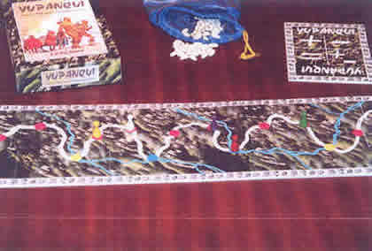 Chacun dirige un lama qu'il essaye de conduire le plus haut possible sur un volcan, sans dépasser le sommet, sinon, il redégringole tout en bas. Plusieurs tours de mises successifs vont permettre d'avancer votre lama. On choisit d'abord un type d'enjeu, puis chacun pioche dans un sac le nombre de galettes de « chicharon » qu'il souhaite, entre une et cinq. Puis les paris sont révélés et, selon le type de défi, c'est celui qui a misé le plus, ou le moins, ou autant qu'un autre, qui avance d'un nombre de cases égal à sa mise. Toutes les mises sont conservées. Attention : en fin de partie, celui qui a le plus de galettes devant lui avance encore de trois cases, tandis que celui qui en a le moins recule de trois cases. Hoppla Lama est un jeu de bluff. Il présente deux principaux inconvénients : 1) appartenir à une famille de jeux qui compte déjà de très nombreux titres, 2) être doté d'une boîte avec une illustration peu aguichante. Cependant, il est probablement parmi les plus réussis des jeux de bluff rapides. Chacun peut évaluer les intérêts des autres joueurs, et tenter de prévoir leurs mises. Le fait que le capital des mises appartienne à tous apporte un élément intéressant. Il faut prévoir la fin de partie, et ne pas oublier que le plus riche en galettes avancera de trois cases, ce qui peut tout changer. Rapide, amusant, et intelligent. Les membres du jury de Boulogne-Billancourt ne s'y sont pas trompés, en primant le prototype connu à l'époque sous le nom de Yupanqui.
