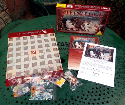 Le thème improbable de Hundsgemein est l'attaque de chiens par des gangs de puces. Et vous êtes l'un de ces gangs. Les chiens sont disposés dans les douze rues du quartier mal famé. À tour de rôle, les joueurs posent une de leurs puces sur un des pâtés de maison sans pouvoir faire voisiner deux puces identiques, dans le but de conquérir la majorité dans les rues les plus richement fréquentées. La difficulté est de se souvenir de qui a posé quelles puces. Une fois toutes les puces possibles posées, on les retourne face joueur puis on établit les majorités afin d'attribuer les points des chiens. À la fois jeu de majorité et jeu de mémoire, Hundsgemein a un peu de mal à trouver un public.